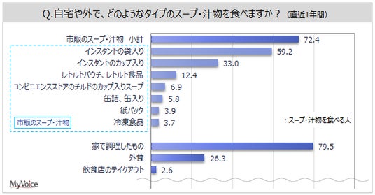 市販のスープ・汁物を食べる人は7割強で、「インスタントの袋入り」が59.2%、「インスタントのカップ入り」が33.0%となっています。