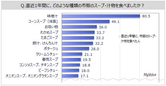 直近1年間に市販のスープ・汁物を食べた人が食べた種類は(複数回答)、「味噌汁」が80.5%、「コーンスープ(洋風)」が49.1%、「お吸い物」「わかめスープ」「たまごスープ」「豚汁、けんちん汁」が各30%台となっています。