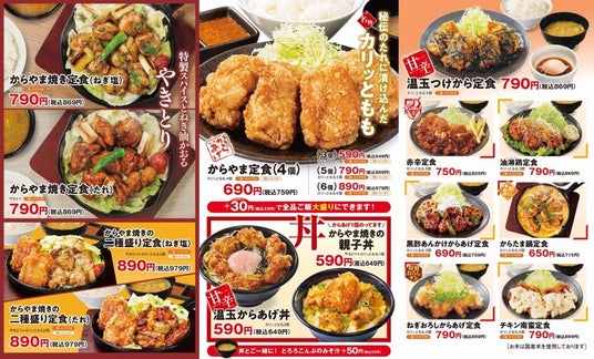 2023年3月、とことん「カリッともも」をお楽しみいただける11種類の定食に加え、独自の調理法で揚げ焼きにすることで香ばしくジューシーな、ご飯のおかずとして楽しめる新感覚のやきとり「からやま焼き」が仲間入り。