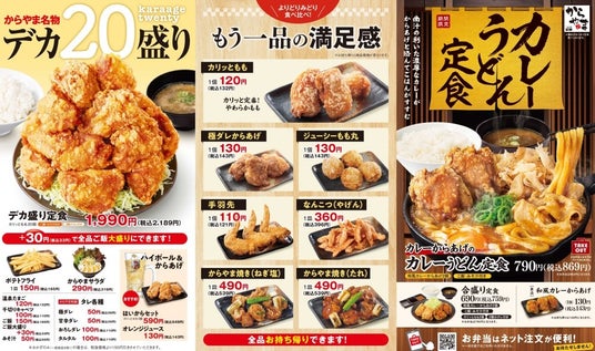 期間限定メニューの「カレーからあげのカレーうどん定食」の他にも、看板メニューのカリッとももと一度に楽しめる「合盛り定食」や、「和風カレーからあげ」をご用意いたしました。また、お弁当としてテイクアウトでもご利用いただけます。