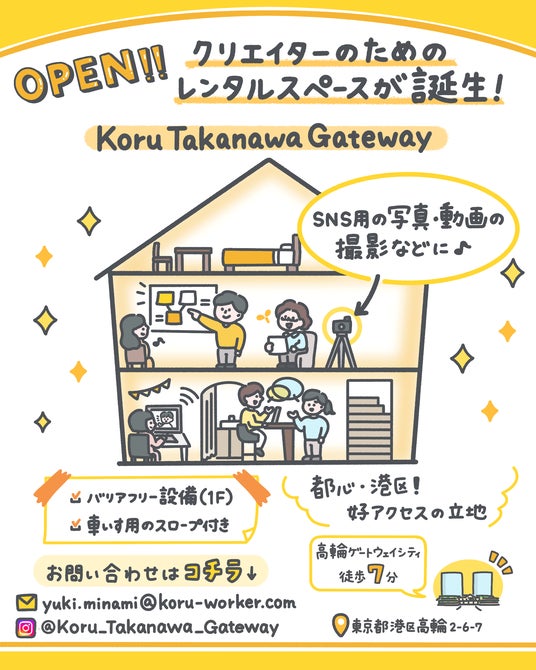 Koru-workers株式会社(以下、Koru-workers)は、2024年1月25日よりクリエイターのためのレンタルスペース「Koru Takanawa Gateway」をオープンします。