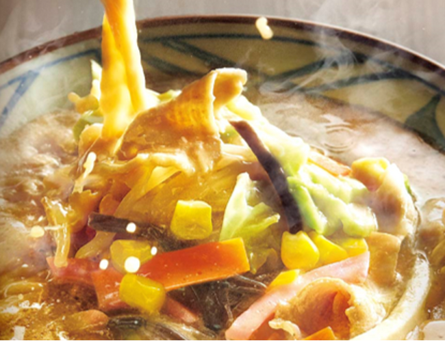 豚骨仕立ての濃厚なちゃんぽんだしに、肉や野菜などの8種類の具材を打ち立てうどんとともに楽しめる『豚ちゃんぽんうどん』が3年ぶりに登場。今回の特製ちゃんぽんだしは、魚介の旨みと丸亀製麺特製のだしの風味が香る“かえし”が隠し味となり、味の深みとコクが増し、もちもちのうどんとより一層絡む仕立てとなりました。