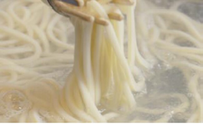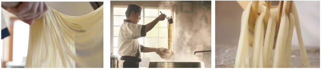 一軒一軒すべての店で、100%国産小麦、水、塩のみから打つうどんを水で締めず茹で釜から直接盛り付ける「釜抜き麺」でご提供いたします。釜抜き麺は、表面が少し毛羽立ち、ふわふわもちもち食感が特長で、牡蠣の旨みが染み出した玉子あんかけがよく絡み、すする度に口いっぱいに濃厚な味わいが広がります。