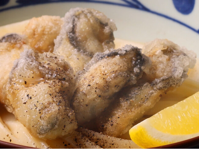 粉をはたいてからっと揚げた牡蠣は、牡蠣の旨みがギュッと閉じ込められ、じゅわっと口いっぱいに濃厚な旨みが広がります。外はサクッと中はぷりっとした食感。揚げ牡蠣にすることで、ぶっかけだしや特製海醤だれ、レモンの果汁、バター風味※のコクがより絡み合い、打ち立てうどんのおいしさを引き立たせます。