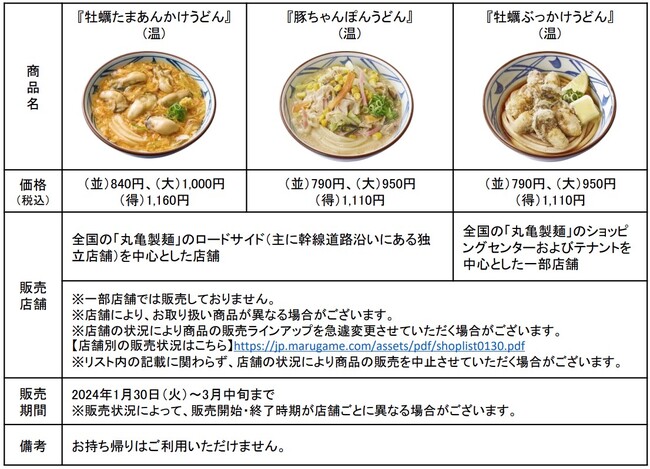 株式会社丸亀製麺(本社:東京都渋谷区、代表取締役社長:山口 寛)が展開する、食の感動体験を追求し、手づくり・できたてにこだわる讃岐うどん専門店「丸亀製麺」は、 2024年1月30日(火)より“ひと手間かけた冬のうまい!”シリーズ最終章の第4弾として、全国の丸亀製麺にて『牡蠣たまあんかけうどん』『豚ちゃんぽんうどん』を期間限定で販売いたします。また、一部店舗では、新作『牡蠣ぶっかけうどん』を同時販売いたします。冬本番を迎えるこの時期に、体の芯から温まる濃厚な味わいの3種類が登場いたします。 一軒一軒が製麺所である丸亀製麺だからこその「打ち立て・生」のうどんをご堪能いただける、ひと手間かけた冬だけのおいしさをお楽しみください。