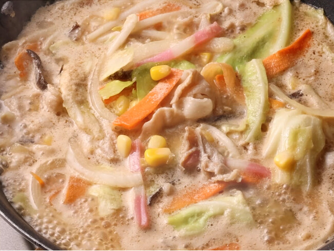 彩り豊かな具材は、豚肉、キャベツ、にんじん、かまぼこ、とうもろこし、玉ねぎ、きくらげ、もやしの8種類。打ち立てうどんとの絡みを考えて、具材や量のバランスを調整しています。豚肉を入れることで、脂の甘さが加わりコクが生まれます。