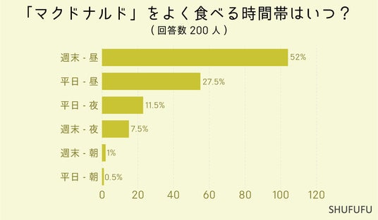 「マクドナルド」をよく食べる時間帯に関しては1位「週末-昼(52%)」、2位「平日-昼(27.5%)」でした。