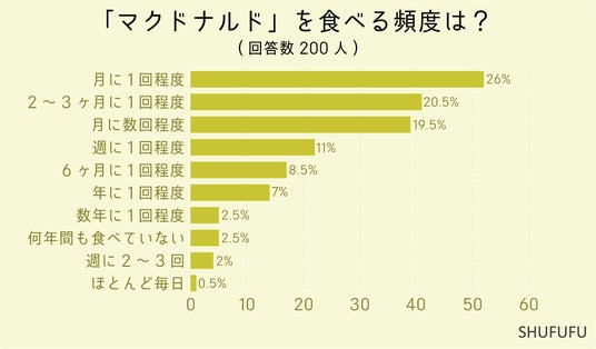 「マクドナルド」を食べる頻度は?の問いに対して最も多かったのが「月に1回程度(26%)」でした。