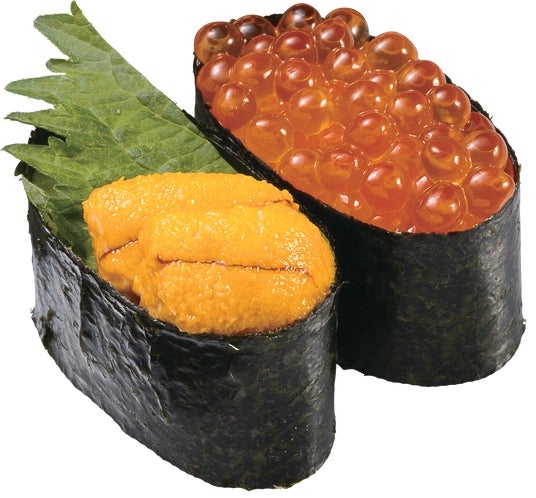 濃厚な旨みの「うに」と、はじける食感の「いくら」を一皿で楽しめる軍艦です。