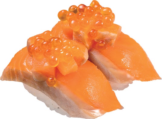 上品な脂のりと旨みのサーモンに、サーモンのたたきをのせ、いくらをトッピングした食べ応えある一品です。