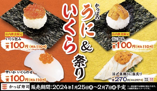 コロワイドグループのかっぱ寿司(カッパ・クリエイト(株) 本社:神奈川県横浜市、代表取締役社長:山角豪)は、2024年1月25日(木)~2月7日(水)の期間、『かっぱのうに&いくら祭り』をかっぱ寿司全店にて開催いたします。