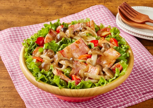 メニュー例:リーフレタスとソテーきのこと厚切りベーコンのサラダ
