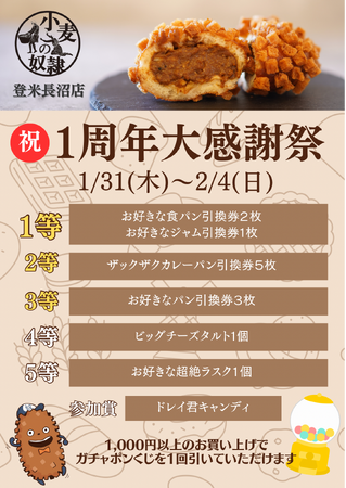 株式会社こむぎの(本社:東京都千代田区、代表:笹山 直人)が展開する【小麦の奴隷】は、ホリエモンこと堀江 貴文が主宰するオンラインサロンHIU(堀江貴文イノベーション大学校)から生まれた「地方活性型エンタメパン屋」です。北海道大樹町で誕生した同ブランドは、FC開始から約3年で114店舗の急成長を遂げました。現在も多数の加盟希望が寄せられており、営業中店舗も含め、全国に156店舗のオープンを準備中です。(2024年1月15日時点) この度、勢いが加速する同ブランドの、宮城県登米市にある【小麦の奴隷 登米長沼店】が2024年1月31日(水)に1周年を迎えます。これを記念し、1月31日(水)から2月4日(日)の5日間、ハズレなしのガチャポンくじが引けるキャンペーンを開催します。1,000円以上のお買い上げでパンの引換券やチーズタルト、ラスクなどが当たるガチャポンくじに挑戦できるという期間限定の豪華企画です。この機会をお見逃しなく。