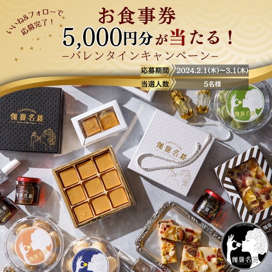 新商品のジュエリーキャラメルの発売記念+バレンタイン企画として当店でお使いいただけるお食事券5千円分が当たるキャンペーンを実施いたします。