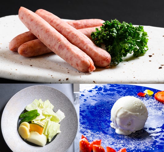 ラムソーセージ、焼き野菜盛り合わせ、選べる北海道ジェラート