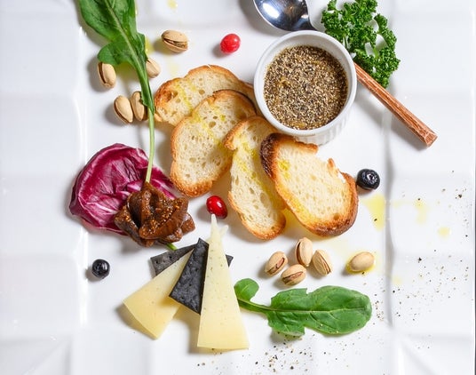 自家製ラムレバーペースト、フランス産セミドライいちじく、マンチェゴ(羊のチーズ)と竹炭クラッカー、料理長が好きなピスタチオの4種盛り合わせ