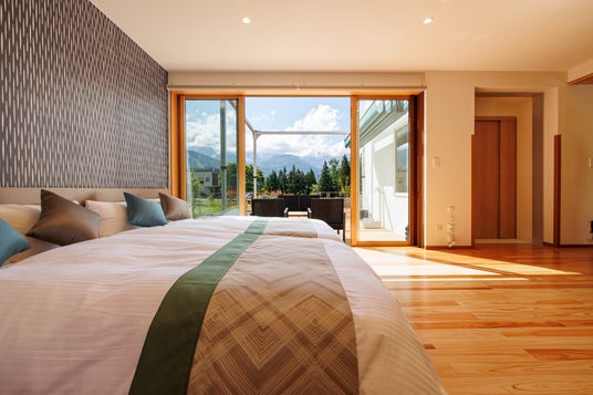 ロフトが付いた杓子岳は、秘密基地のような心躍る空間。セミダブルベッド2台と寝具2組が備わり最大4名まで宿泊できるので、グループ旅行にも最適。大きな窓から見渡す北アルプスの絶景は圧巻です。