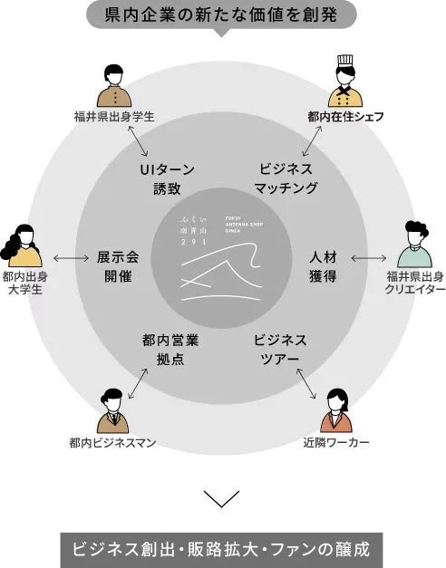 ふくい南青山291は、飲食スペースやイベントスペース、ワークスペースを併設した施設です。都心にいながら、福井とつながる交流拠点として、さまざまなモノ・コトを生み出します。