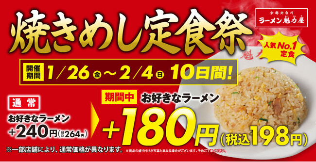 ラーメン魁力屋よりお客様に日頃の感謝の気持ちを込めて、「焼きめし定食祭!」を2024年1月26日(金)~2月4日(日)の10日間限定で開催いたします。