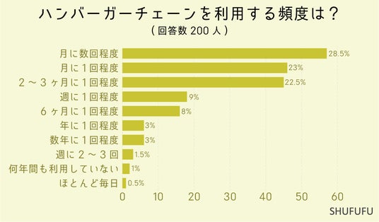 ハンバーガーチェーンを利用する頻度は?の問いに対して最も多かったのが「月に数回程度(28.5%)」でした。 次いで「月に1回程度(23%)」「2~3ヶ月に1回程度(22.5%)」という結果でした。 年に数回の人は「11%」いました。