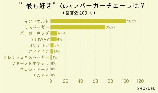 1位は「マクドナルド(50.5%)、2位「モスバーガー(36.5%)」、次いで「バーガーキング(4.5%)」と順番は「最も多く利用するハンバーガーチェーン」と全く同じになりました。