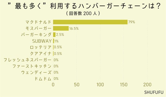 200人にハンバーガーチェーンに関するアンケート調査を行った所、利用頻度に関しては「月に数回程度」と回答する人が最も多かったです。利用する時間帯に関しては、「週末-昼」「平日-昼」が上位2位を占めており、ランチや軽食として利用する人が多かったです。”最も多く”利用する、また”最も好き”なハンバーガーチェーンについて尋ねたところ、どちらも「マクドナルド」「モスバーガー」「バーガーキング」の順となりました。みなさんはどのハンバーガーチェーンを利用していますか?