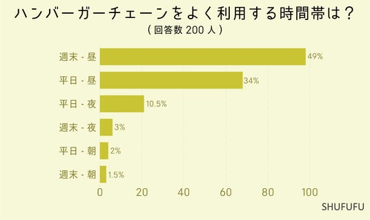 ハンバーガーチェーンをよく利用する時間帯に関しては1位「週末-昼(49%)」、2位「平日-昼(34%)」でした。