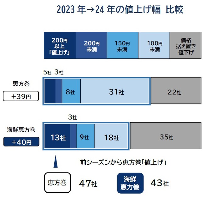 他方、今シーズンは昨シーズンからの価格据え置きや、値下げといった動きが多くみられた。恵方巻では「据え置き・値下げ」が22社(31.9%)、海鮮恵方巻では35社(44.9%)判明し、それぞれ前年から増加した。特に海鮮恵方巻では、大幅な価格引き上げが目立った昨シーズンに比べ、値上げでも小幅なものが多い点が特徴的となる。