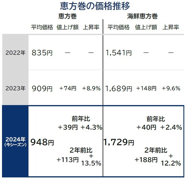 全国の大手コンビニエンスストアや外食チェーン、スーパー、百貨店、著名な日本料理店など計104社で販売される2024年節分シーズンの恵方巻価格を調査した結果、一般的な五目・七目の恵方巻(太巻・1本当たり)における平均価格は948円(税込)だった。1年前(23年節分、「昨シーズン」)の909円に比べて39円、率にして4.3%の値上がりとなったほか、2年前に比べると113円・13.5%の値上がりとなった。豪華で高級志向な品が多い海鮮恵方巻では平均1729円となり、前年(1689円)から40円・2.4%の上昇となった。