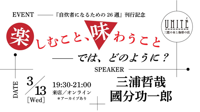 料理を入り口に、お二人の対話によって「楽しむこと、味わうこと」の深淵について考える会となります。