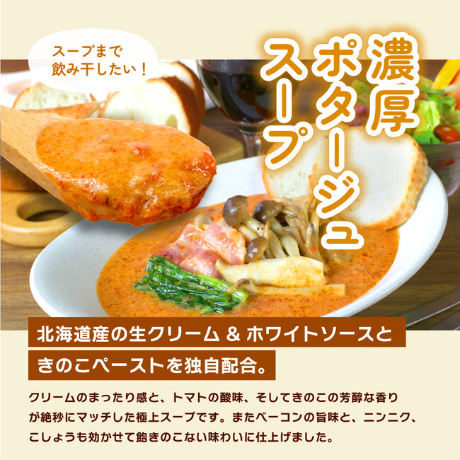 『~ポルチーニ茸&トリュフ香る~濃厚きのこポタージュトマト麺』は、7種のきのこの芳醇な香りと、とろりと濃厚なクリーミースープがトマトの酸味と見事にマッチした、トマトラーメンです。2018年秋、「太陽のトマト麺」の店舗で期間限定メニューとして登場し、3ヶ月で27,000食以上売り上げた人気メニューで、復刻の声も多く、このたび通販サイト限定で期間限定発売をすることとなりました。