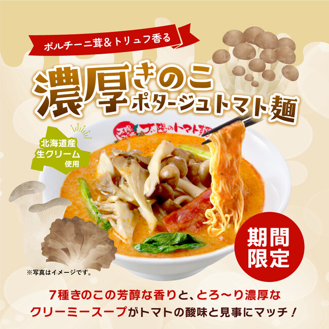 トマトラーメン専門店「太陽のトマト麺」(運営:株式会社大阪王将)は、公式オンラインショップにて、『~ポルチーニ茸&トリュフ香る~濃厚きのこポタージュトマト麺』を、期間限定で発売いたします。