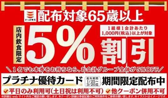 ・サービス内容:かっぱ寿司にて、店内飲食を1,000円(税込)以上ご利用いただき、レジにて65歳以上の方が「プラチナ優待カード」をご提示いただいた際、お会計より5% (税込)割引いたします。