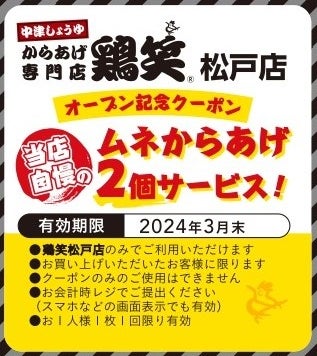 鶏笑 松戸店のオープンを記念して、松戸店限定で「ムネからあげ2個」がもらえるクーポン券を、数量限定で店頭などでお配りしています。以下のクーポン画像をスマートフォン等でご提示いただいても有効です。皆様のご来店をお待ちしております!