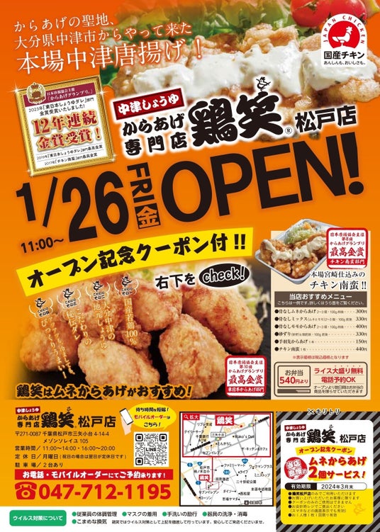 からあげ専門店「鶏笑 松戸店」2024年1月26日(金)オープン!