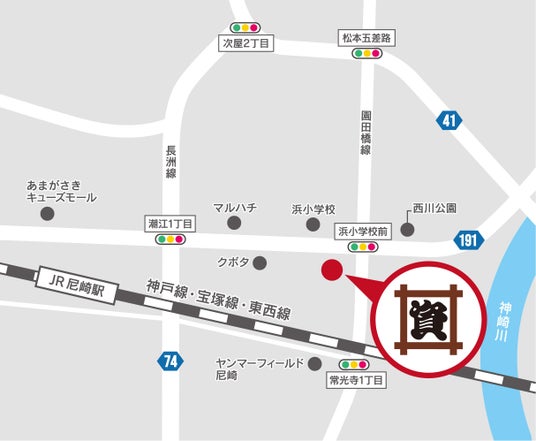 「資さんうどん尼崎浜小学校前店」「資さんうどん尼崎浜小学校前店」は「JR尼崎駅」より徒歩で約10分。「浜小学校前」の交差点からすぐの場所に位置し、公共の交通機関でも、お車でも便利にご利用いただけます。