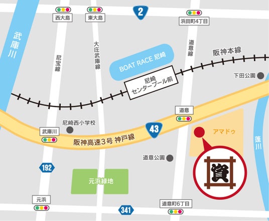 「資さんうどん尼崎アマドゥ店」「資さんうどん尼崎アマドゥ店」は、スーパーやカー用品、生活雑貨など、豊富な店舗が集積しているショッピングモール「アマドゥ」内への出店となります。「阪神本線尼崎センタープール前」から徒歩5分、国道43号線沿いに面しているので、お車でも便利にご利用いただけます。