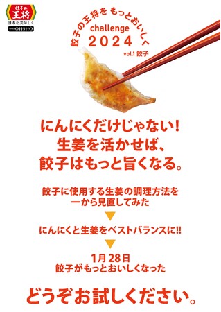 2024年1月28日から提供いたします「餃子」は、餡に使用している生姜の調理方法を見直し、より【本件に関するお問合せ先】 株式会社王将フードサービス 営業企画部 電話:080-3491-4025 メールアドレス:prkouhou@ohsho.co.jp生姜の香りや風味を活かした味わいとなっております。