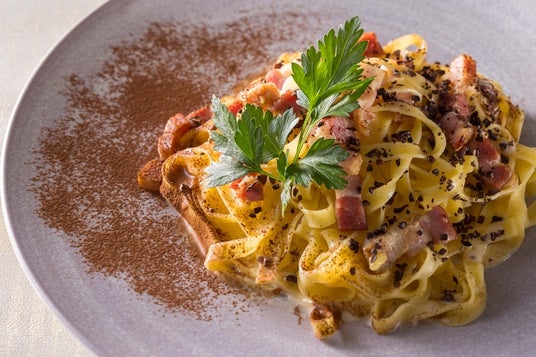 ・フィットチーネのカルボナーラ ココアパウダーとともに