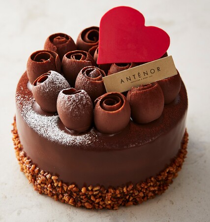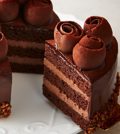 チョコアーモンドスポンジにガナッシュクリームを重ね、チョコレートでコーティング。ナッツの香り豊かなジャンドゥヤチョコを飾りました。ご家族で楽しめる王道のチョコレートケーキです。こちらのケーキも赤いハートのチョコプレートに、メッセージをお書きできます。(一部店舗は除く)