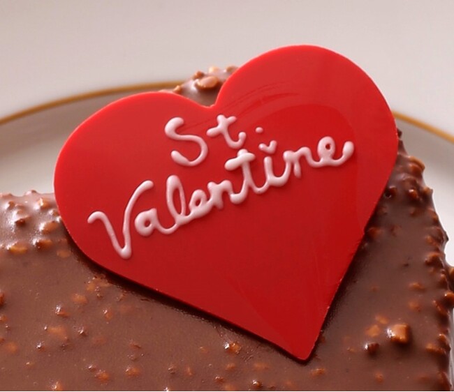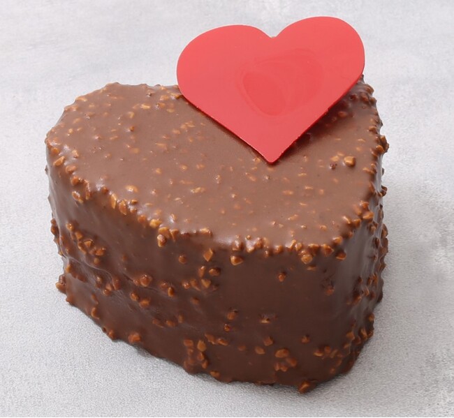 くちどけなめらかなジャンドゥヤガナッシュクリームにチョコアーモンドスポンジを重ね、キャラメリゼしたアーモンドチョコをコーティングしました。ジャンドゥヤの風味豊かでコクのある味わいとナッツのざくざくとした食感をお楽しみください。ご希望の方には赤いハートのチョコプレートに、メッセージをお書きいたします。(一部店舗ではお書きできません)
