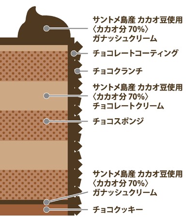 カカオの力強い風味とフルーティー感をもつサントメ島産カカオ豆のチョコレート(カカオ分70%)を使用。一口食べるごとに濃厚で奥深い味わいのチョコレートの風味が口いっぱいに広がります。チョコレートケーキ好きにはぜひお試しいただきたい一品です。