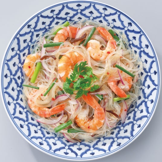 ゆでたえびなどの魚介と春雨を野菜と和えることで、エスニック気分が味わえる「ヤムウンセン」の素です。具入り調味料+春雨のセット商品です。