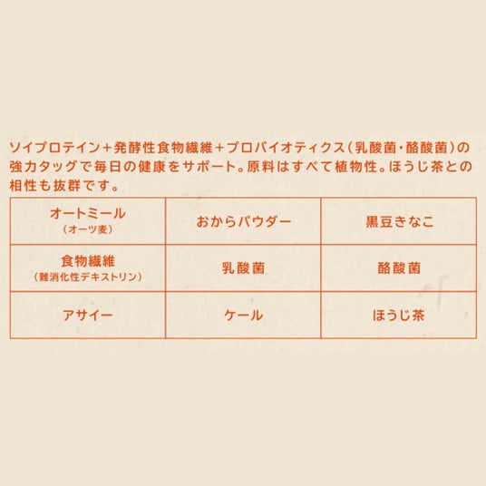 粉末状大豆たんぱく(国内製造)、デキストリン、ほうじ茶、おからパウダー、オーツ麦パウダー、黒豆きな粉、難消化性デキストリン、乳酸菌(殺菌)、アサイーエキス未、ケール未、酪酸菌/甘味料(ステビア)、(一部に大豆、乳成分を含む)