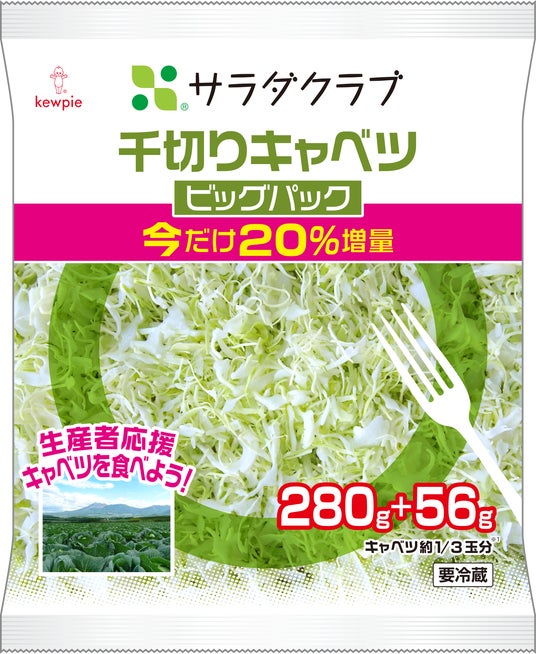 サラダクラブでは2021年より毎年、キャベツが旬を迎え収穫量が増えるこの時期に、九州、北陸・東海地方を中心に「千切りキャベツ」の増量企画を実施してきました。本企画は、お客様がお得に商品を手に取ることができるようになるだけでなく、生産者にとっては出荷量が増えることで収入増につながり、販売店にとってもお得な商品の販売で売り上げアップに繋がる「三方よし」の企画です。今回、コロナ禍前にあたる2019年対比で約190%※2と好調な「千切りキャベツ ビッグパック」を初めて全国規模で増量します。期間中は通常280gのところ、20%増量して336gとなり大変お得です。