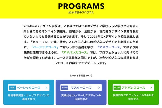 2024年のXデザイン学校は、これまでのようにXデザイン学校らしい学びと研究する楽しさのあるオンライン講座を、自宅から、全国から、専門的なデザイン教育を受けていない人でも受講することができます。そして2024年のXデザイン学校は変化します。「ヒューマン、企業、社会」という三方よしのビジネスデザインを実践するために、「ベーシックコース」「マスターコース」「アドバンスコース」の三つのコースを募集します。