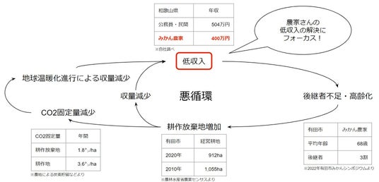 生産されたみかんのうち約5割に外皮に傷などがあり、味は美味しいのに見た目が良くないとの理由で安く買い取られてしまっており、それらをきっかけに、農家さんの収入減→後継者不足・高齢化→ 耕作放棄地の増加→収量減少→CO2固定量の減少→地球温暖化進行によるさらなる収量減少→農家さんの収入減という悪循環に陥っています。そこで私たちは、農家さんから傷のあるみかんを傷のないみかんと同価格で買い取り、冷凍みかんに加工し販売することで、農家さんの収入を向上させ、後継者増加→耕作放棄地減少→CO2固定量増加→地球温暖化抑制という善循環に変えていきたいと思っております。