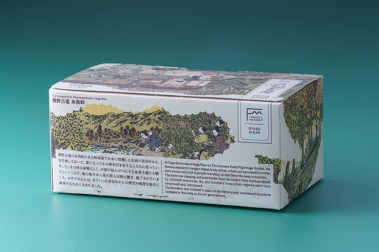 私たちは、「そういった有田みかんの歴史や風習を次世代に継承していきたい」「2025年大阪万博をきっかけに、和歌山・有田のみかんの美味しさ、歴史や風習の素晴らしさを世界中に伝えたい」と想い、紀伊国名所図会の糸我峠の図会をモチーフにパッケージデザインを制作させていただきました。