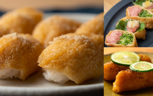 左大きい画像:一口いなり/右上段画像:とろたくいなり/右下段画像:炙りいなり