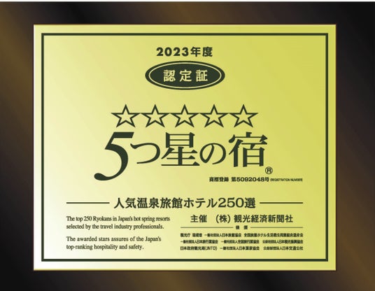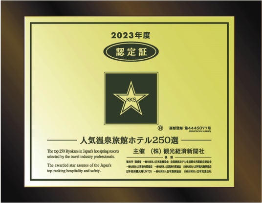 旅行会社社員など”旅のプロ”が選んだ温泉旅館ホテル250選です。観光経済新聞社主催にて、1年に1回実施、発表しています。 専用投票ハガキを全国の旅のプロに配布し、投票にご協力いただいており、その旅館・ホテルに投票した理由は「料理」「接客」「温泉浴場」「施設」「雰囲気」の5項目の中から選択されています。